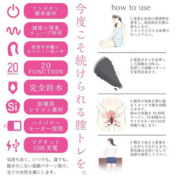 いつでも誰でも、ずっと気持ちイイ♪膣圧を向上して『極上名器』に変身させる膣トレグッズ「ウェービーオルガ ブラック」。膣壁に密着するウェーブ形状のデコボコした表面の構造が、男性を虜にする名器に変身させます。こまめに挿入してトレーニングすることで徐々に膣圧アップ!取り出しやすいスマートな取っ手は邪魔にならないので、普段の生活をしながらでもトレーニング可能。強さが選べる20種類もの振動パターンを搭載!ボタン一つの簡単操作で異なる刺激を堪能できます。また、トレーニングだけでなくクリバイブとしても快感を得られるハイパワーモーター仕様です。本体の充電は簡単なマグネット式USB充電(専用ケーブル付属)、完全防水仕様、医療用シリコン製。 |