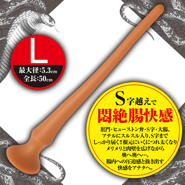柔らかくて伸縮性のあるソフトシリコン素材を使った「ロングコロンスネークプラグ」です。こちらはLサイズで太さはそれ程でもなく、全長50cmで最大径5.3cm!S字や大腸までしっかり届き、アナルにスルスルと入る仕様でエキスパートだけが味わえる気絶しそうなほどの悶絶快感もしっかりと味わえます♪根元にいくに連れてどんどん太くなるデザイン。メリメリと肉壁を広げながら奥へと進み、腸内にディルドが収まり腹部がいっぱいになる感覚を堪能したり、抜き出す悶絶快感をお楽しみ頂けます♪腸内を傷つけない柔らかいリキッドシリコン製でモチモチとした滑らかな触感が気持ちいい!底部には吸盤もついているのでいろんな体勢で挿入プレイをお楽しみ頂けます! |