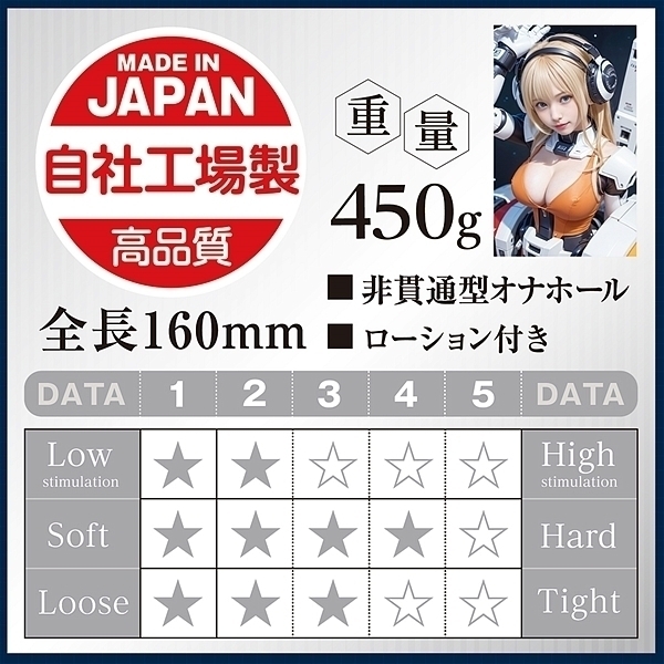 国内自社工場製の日本製。「AIが考えた内部構造」+「下部二層」の極上名器。AIが作る理想的なオナホールと理想的な女性イラスト、上は柔らか下は固めの「ソフト&ハードの片面二層」採用。空間を敢えて広くする事でバキューム効果を発生させる設計。弾力のあるフレキシブルスキン使用し高弾力・高伸縮、匂い控えめ。 |