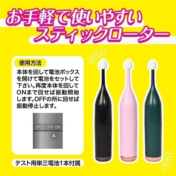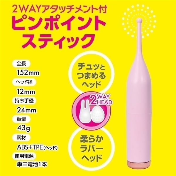 ピンポイントを徹底刺激するスティックローター登場。先端シリコンヘッドが丁度良い部分を絶妙振動で刺激します。シリコンヘッドはポイントヘッドとチュッとつまめる二又ヘッドの2WAY使用が可能です。軽量ボディだから使用感もバツグン!とにかくお手軽で使いやすいスティックローター。●カラー:ピンク