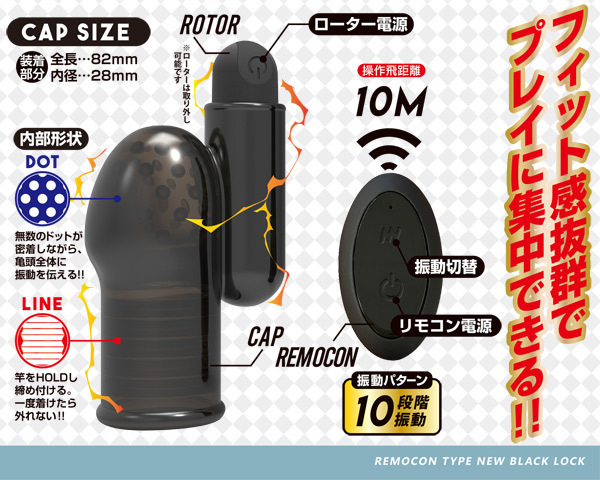 爆発的人気の亀頭責めローター「ブラックロック」シリーズ最新作!小型リモコンによる遠隔操作でハンズフリーで楽しめるUSB充電式ローター。フィット感抜群のキャップ内には密着感を高めるドットと横溝を配置!サオをギュッと締め付けながら亀頭を細かに刺激する!振動は10段階搭載、操作飛距離は10mまで対応。防水式でお手入れ簡単。 |