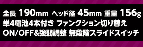 仕様:パッケージ:22.8×16.3×5.5cm 本体:全長19.0cm ヘッド径4.5cm 重量:156g 電池:単四電池×4本使用