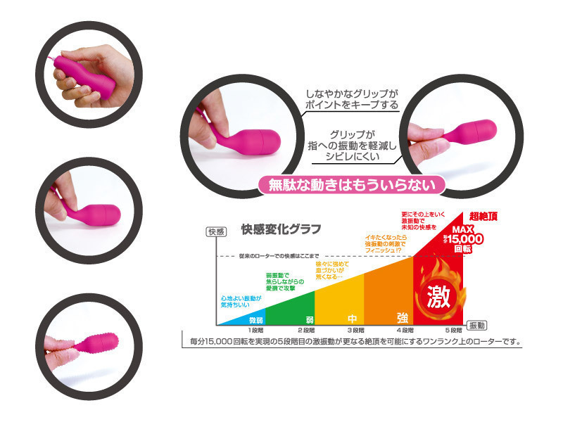 定番のシングルローターに使いやすさをプラス!持ち手部分がついてグッと遊びやすくなったコンパクトローター。尻尾のようなつまみ部分を持って使用することで、振動による手の痺れがなくなって快適!より長く責めることができるようになり、ラブタイムにもいっそう熱が入るかも。微弱〜激までの5段階調節で、未知の快感を得られるシングルローターです。単四電池×2本使用。 |