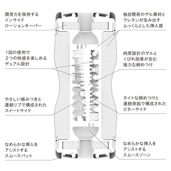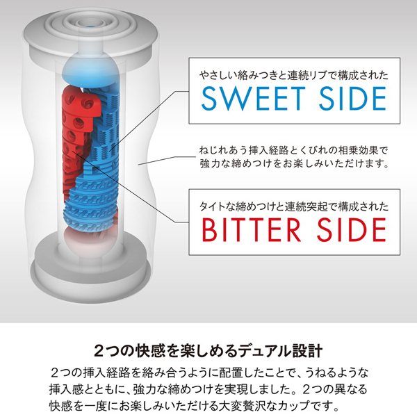 ワンランク上のテンガカップ、TENGA デュアルフィールカップが登場。プレミアムなダブルの快感がもたらす締めつけは、厳選された最高品質の素材と長年の実績の賜物!双方向から楽しめるプレミアムなWの快感。ハードな締め付けのビターサイドと優しく絡むスイートサイド。これら2つの異なる刺激が1つのカップで楽しめる♪最高品質の素材を採用したことでさらに洗練されたプレミアムなテンガの魅力。それぞれの快感をぜひお楽しみください! |