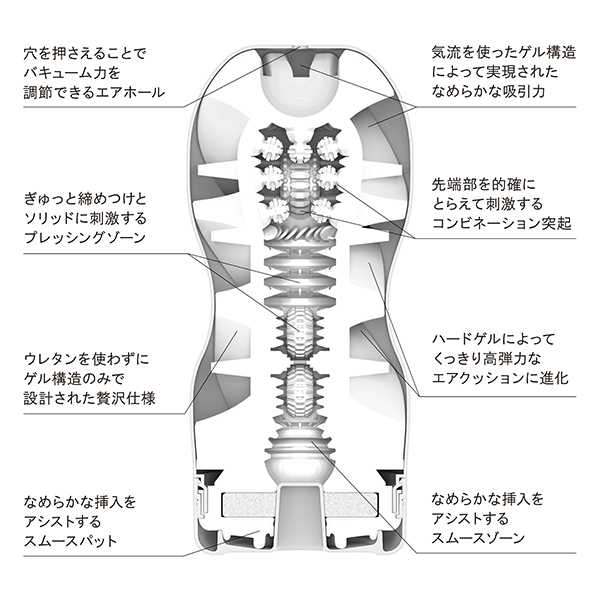 くっきりと刺激する超ハード設計!インナーホールにハードゲルを使用した「TENGA AIR CUSHION CUP HARD」。これまでのテンガシリーズとアウター感は同じですが、内部の中間素材にウレタンを使わず「エアクッション」を採用したことでこれまでにない挿入感を実現しています♪超ハード設計で極上の絡みつき!螺旋状に配置されたゲルの柱構造による独自のエアクッション構造が、ウレタンでは再現不可能な繊細でやさしい弾力を実現♪絡みつくように設計されたディテールとエアクッションによる繊細な弾力!内部構造もハードな構成でヒダ細かく刻まれた突起、カリを撫でるヒダ、最奥の亀頭を撫で回す四方からの突起と尿道へのアタック、これらのギミックが所狭しと待ち構え、バキュームコントロールすることで変化する挿入感と共に射精感を高めてくれています。最高の絡みつきとカップとインナーホールのみのユニークな設計による独特のクッション性!他には無いエアクッションによる繊細な弾力が織りなす極上の快感をぜひお楽しみください♪ |