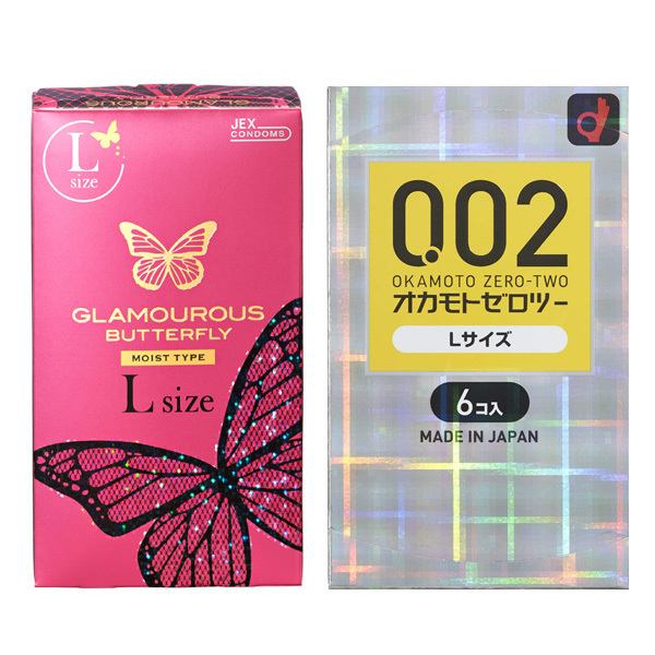Lサイズコンドーム2点セット※【セット内容】グラマラスバタフライ L1000(u00140)、オカモト うすさ均一0.02EX (Lサイズ)8個入り(u00063)※パッケージのリニューアルにより、画像とデザインが異なる場合が御座いますが中身は同じです。