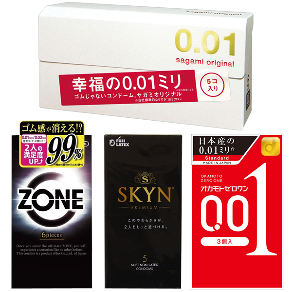 オカモト・サガミ・ジェクス・不二ラテックスの人気コンドームが大集結!※【セット内容】<オカモト>オカモトゼロワン 3個入(u00472)、<サガミ>サガミオリジナル0.01 5個入(u00475)、<ジェクス>ZONE 6個入り(u00412)、<不二ラテックス>SKYN 5個入(u00119)