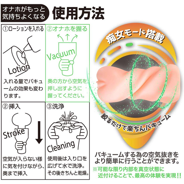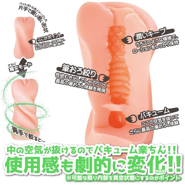 強力バキュームで貴男の精を搾り取る!家庭教師のお姉様が繰り出す、強烈絞り上げバキュームが自慢の痴女感たっぷりな非貫通オナホ。絞るだけで簡単に強力吸引!可能な限り内部を真空状態にすることでこれまでにない快感が得られます。片手で握りやすいペットボトルのような形状も相まって使い心地は抜群!日本製の高品質素材を使用していて、特有の素材臭と油分も極限まで抑えられています。 |