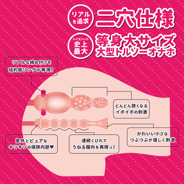 本物以上の満足感がここにある!トイズハート史上最大の等身大サイズ、95cmのむっちりとしたデカ尻がたまらない10kgの超肉厚な据え置きオナホ。後ろの穴から前の穴まで精巧に作り込まれたリアル造形仕様で揉み心地抜群!好みの下着を装着させるなど着せ替えも可能で、対応できる体位は6種類と豊富♪素材は柔らかくハリのあるエラストマーを使用。※こちらの商品は受注発注商品の為、ご注文から発送までに3、4営業日掛かる場合が御座います。 |
