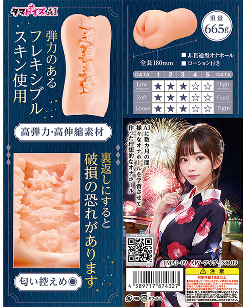 AIが学習して設計した新しいオナホールです♪タマトイズの独自素材「フレキシブルスキン」を使用し、弾力性と伸縮性に優れた快適な使用感を提供します!左右のヒダが狭く設計されており、上下左右からしっかりと挟み込むような感触で、強い刺激を楽しむことができます♪花火の大輪をイメージした肉厚ヒダ構造が、さらに気持ち良さを引き立てます!匂い控えめで使いやすい非貫通タイプです♪●メーカー型番:TMAI-09 |