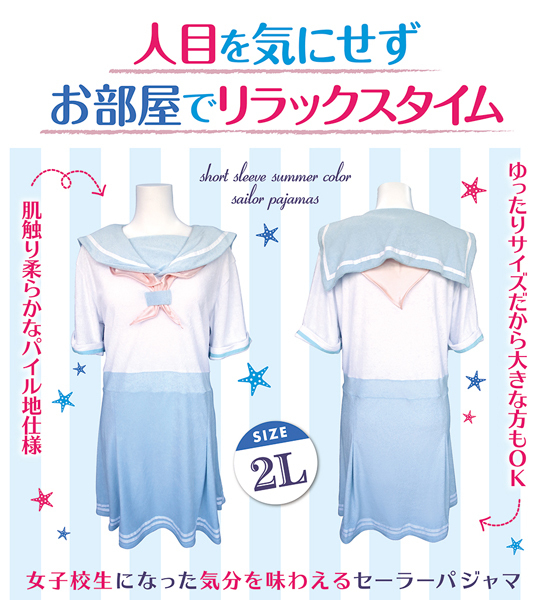 爽やかな水色を基調としたセーラー服タイプのパジャマです♪肩、腕、胴回りに余裕を持たせたストレスフリーな設計で、ゆったりとリラックスした時間を過ごすことができます!柔らかいパイル地を使用しており、肌触りも良く、リラックスや睡眠時に快適さを提供します♪ワンピースタイプで締め付けが少なく、簡単に着用できるデザインです!大きめのサイズ設計なので、体型を問わずフィットし、誰でも心地よく着用できます♪ TAMS-1211