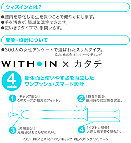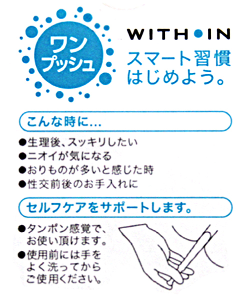 性交前後や生理中、オリモノが多い時に◎デリケートゾーンを内側から綺麗にお手入れできるクサノハ化粧品の日本製膣洗浄器(管理医療機器)。挿入しやすいスリムタイプで、衛生的な一回使い切りタイプ♪膣内に挿入してワンプッシュすれば手を汚さず簡単に洗浄できる!使い心地はとってもナチュラルで、初めての方でも安心してお使いいただけます。無色透明&無味無臭 |