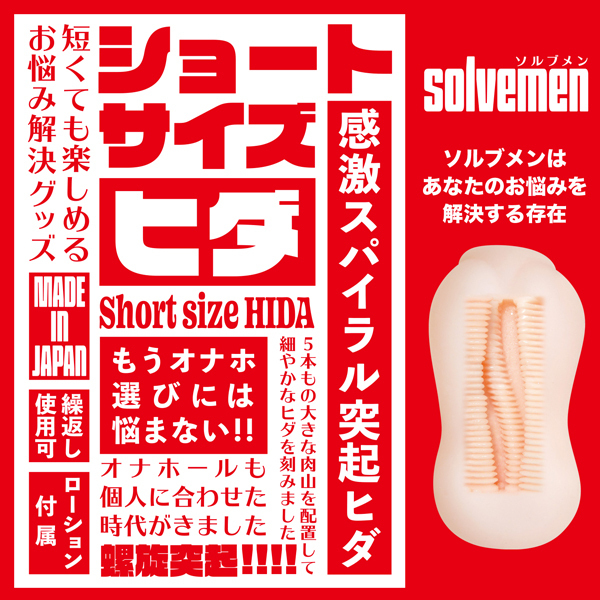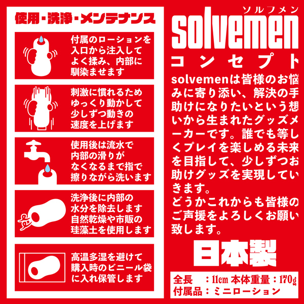 突起ヒダが螺旋状に続くスパイラル構造!全長11cm、繰り返し使えるショートサイズの日本製オナホ(非貫通)♪全ての人のお悩みに寄り添い解決したいという思いから開発された「ソルブメン」。短い人も長い人も楽しめるように2種類のタイプをご用意!「どれを選んでいいか分からない」というお悩みを、このソルブメンが解決します。ミニローション付 |