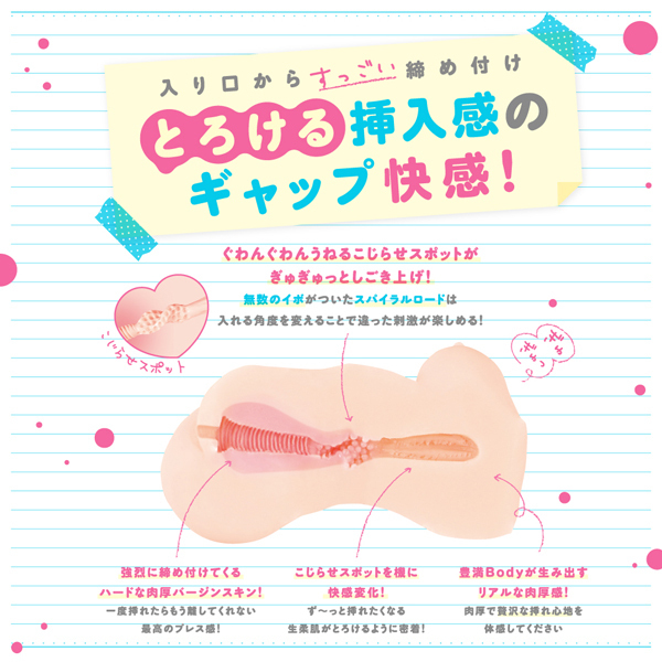 ハードtoソフト!快感変化のギャップ構造。ぐわんぐわんうねるこじらせスポット搭載!ずっしり肉厚540gの豊満Bodyはとっても贅沢な挿れ心地!強烈に締め付けるハードなバージンスキンの入口から、ずーと挿れたくなるようなとろとろソフト素材への快感の変化を楽しめます!真ん中に配置されたこじらせスポットは、ピストンのたびにぎゅぎゅっとしごき上げ!締め付け・こじらせ・生柔肌の3つの快感。贅沢な挿れ心地を体感してください。 |