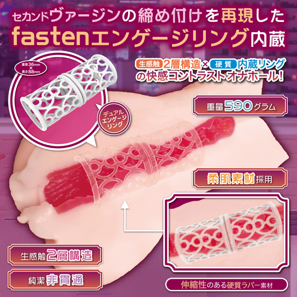 びらびらラビアがいやらしい成熟フォルムボディ!ヴァギナ、モノクローズはセカンドヴァージンの締め付けを再現する「fastenエンゲージリング」をデュアルで内蔵した非貫通オナホールです。リングの効力により、初回はまるで「穴径の拡張を拒む」かのような感触をお楽しみいただけます。2回目以降のご使用では、伸縮性のあるfastenエンゲージリングが「貴方のサイズ」に拡張され、徐々に密着感が増加。使うほど「フィット感が増す」成長する非貫通オナホールとなっています。厚生労働省準拠素材採用で舐めての安心♪