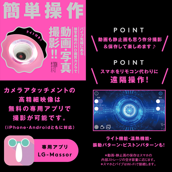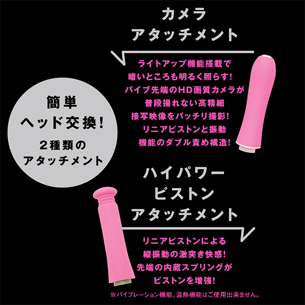 あの娘のナカや奥まで見えちゃう♪バイブの先端にアソコを接写できるHD画質カメラを搭載した高機能なバイブ「CAMERA PISTON VIBE 90(カメラピストンバイブ90)」です。ライトアップ機能がついたアタッチメントで動画撮影や写真撮影も楽しめる!パートナーのあそこのナカを見たい欲求を満たしてくれるとともに、温感を楽しめるバイブとしても優秀なのでハイパワーピストンとリニア式のピストンアクションで極上の快感を体験できます♪お好みのリズムで感じられる9パターンのバイブ振動にリニア振動による重厚な奥突きピストン10パターン!高品質シリコン仕様でやさしい肌触りを確かめながら、温熱機能搭載で人肌感覚のぬくもりもお楽しみ頂けます。2種類のアタッチメントで簡単ヘッド交換、飽きのない充実機能!本体は充電式で充電時間約210分。最大連続稼働時間約70分(初期振動パターン未変更時)です。生活防水機能付き。付属品はアタッチメント、USBプラグ式充電コード。※カメラ機能は無料の撮影専用アプリをダウンロードしてお楽しみください。 |
