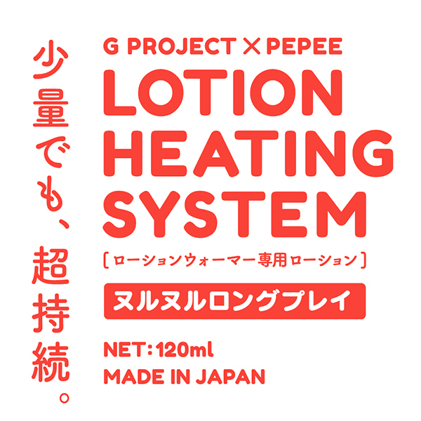 少量でも、超持続。G PROJECT×PEPEEによるLOTION HEATING SYSTEM ローションウォーマー(v02705)で温める専用ローション!より温かく感じるように独自に開発しました!ヌルヌルの感触が心地いい高粘度タイプ。ロングプレイに最適です。片手で簡単!ひねって出せるスライド式キャップを使用しています。直接肌に触れるものだから、安心の国内生産&国産素材。※常温でのご使用も可能です。 |