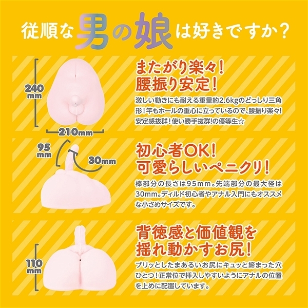 一線を越えますか?背徳感満載の男の娘ボディには「してはいけない感」がいっぱい!どっしり重量約2.6kgの据え置き完全固定型男の娘ホール!激しい動きにも耐えるどっしり三角形!竿もホールの重心に立っているので、腰振り楽々!安定感抜群・使い勝手抜群の優等生!初心者OK!可愛らしいペニクリは棒部分の長さが95mm。先端部分の最大径は30mm。ディルド初心者やアナル入門にもオススメな小さめサイズです。背徳感と価値観を揺れ動かすお尻は正常位で挿入しやすいようにアナルの位置を上めに配置しています。男の娘の引き締まった絶品アナルを思う存分ご堪能ください!従順な据え置き男の娘はフローリングやベッドなどにピタッと固定!挿れて、挿れられ、四方八方どんな方向からの力にも耐えれます。あなたの性癖が目覚めねじ曲がる至極の1本!アソコは好きな形に曲げられる関節骨格内蔵!表面はすべすべ、ふんわりとろける感触。柔らかいのに骨格内蔵だから可動も自由自在。初めての方も、男の娘好きの方も、ニューハーフ好きの方も全てを満足させる万能ペニクリ。耐久性抜群の大臀筋を揉み放題!もう戻れない...戻らないっ!!超リアル構造で特大ギミックいっぱいのはっきり刺激!ぐわんぐわんウネル絶品ケツマ●コ体験!2連特大イボのパーフェクトウェーブにグニグニ巨大壁の弾力プレス!極め付けにはキュッと締まった吸引フィニッシュスポット!まさにお尻絶頂新世界!あなたのサイズに合わせて変化する形状記憶素材!プリプリの本素材は伸縮性が高く、様々なサイズに対応します。使うたびにあなたの形状に変化し、毎回違った締め付け刺激を体感できます。直接肌に触れるものだから、安全性と感触にこだわった高品質なエラストマーを使用しています。保管に便利な専用収納ケース付き。パッケージイラスト:maruku |