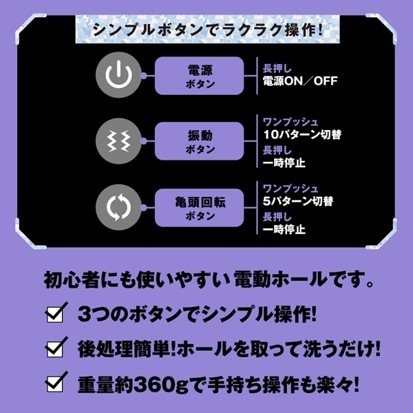 亀頭回転パワフル振動のハイクオリティ電動オナホが登場!一番敏感な亀頭に回転5パターン!竿部分には芯まで震えるヘビー級振動10パターン!全50バリエーション!異なる性感帯に最適な刺激を与える快感コンビネーション!高性能モーター搭載によりパワフルなのに静かな回転振動を実現しました。稼働音を気にせずプレイに集中できます。初心者にも使いやすい電動ホールです。シンプルな3つボタンで片手でも操作が可能です。インナーホールを取って洗うだけなので、後処理も超簡単です。重量約360gで手持ち操作も楽々です。直接肌に触れるものだから、安全性と感触にこだわり高品質なエラストマーを使用しています。伸縮性抜群の柔らか素材が吸い付きながら絡みつく粘膜刺激!もっちり柔らか人肌感触の挿入口はリアルを超えた幸福快感!竿部分をダイレクトに刺激する360°ビラビライボの敏感刺激!最先端技術によりコンパクトなのにパワフル&多機能!インナーホールにもこだわった電動ホールです!静音設計≦60dB。充電用USBケーブル付属。 |