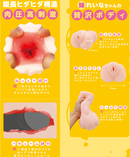 柔肌のイカ腹ボディで包み込む!「いかばらしすたーず」妹れいなちゃんの重量級肉厚オナホ(非貫通)。重さは約900g!柔らかなハリのある初々しい大ボリュームボディに仕上げました♪ずしっとしたボディ×バキューム感抜群のキツキツ膣道に加えて、縦に伸縮する肉ヒダ&最奥にランダム配置されたイボで徹底刺激!ぽっこり膨らんだ肉厚壁の極上刺激を是非ご体感あれ♪ローション付属